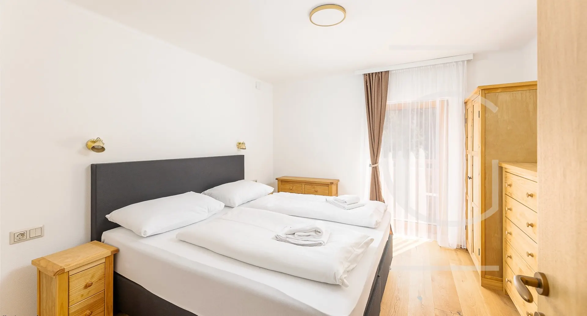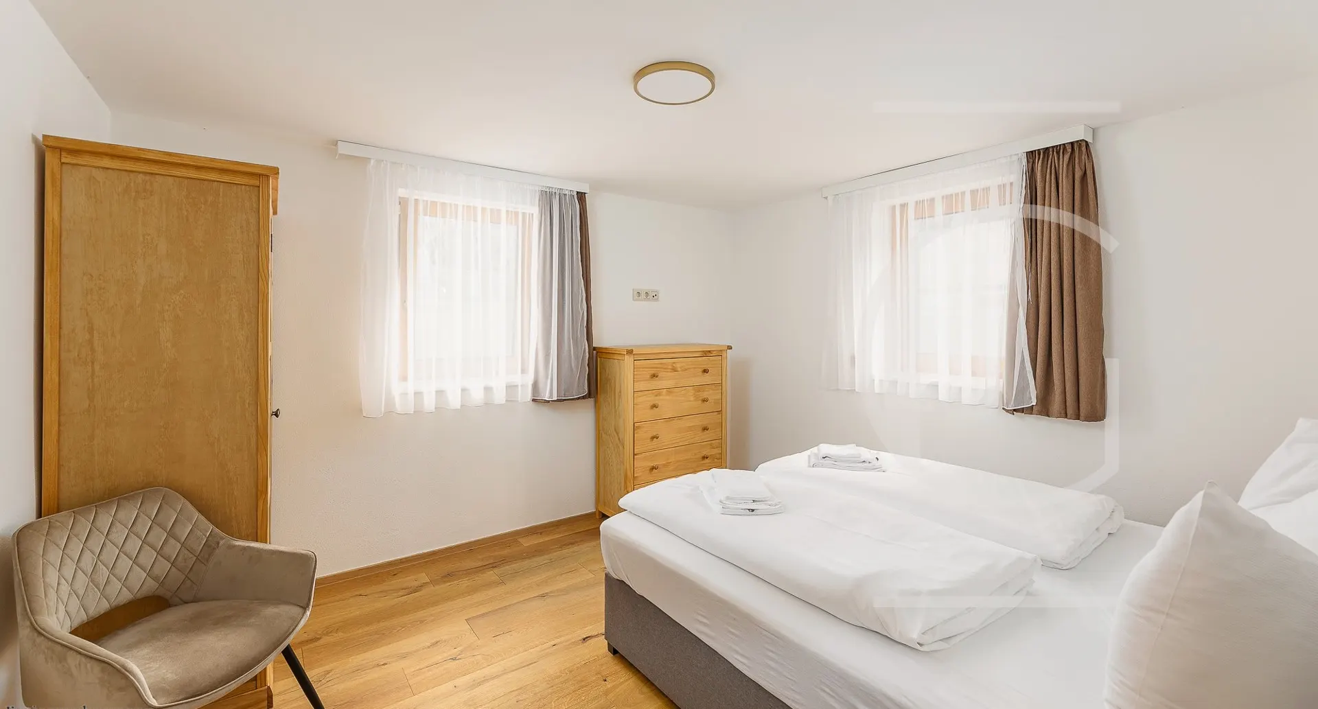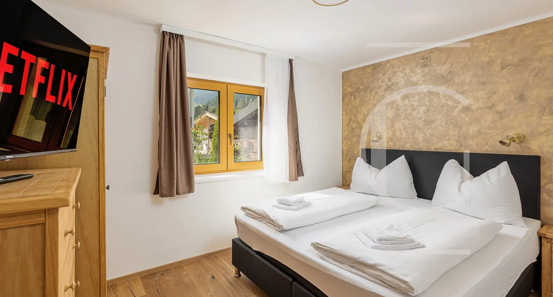 Die ausziehbare Couch bietet zwei zusätzliche Schlafplätze bei Bedarf. Auf dieser Etage befindet sich ebenfalls das Master Schlafzimmer, als auch zwei getrennte Badezimmer mit jeweils einem WC. Über die innenliegende Stiege erreicht man das Untergeschoss, wo sich zwei weitere Schlafzimmer mit südseitigen Fenstern befinden. Weiters befindet sich hier ein WC, Stauraum und der Heizraum.