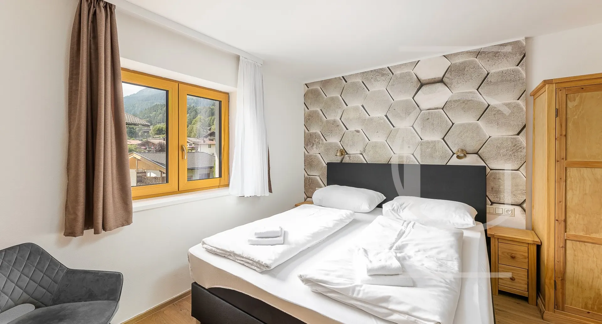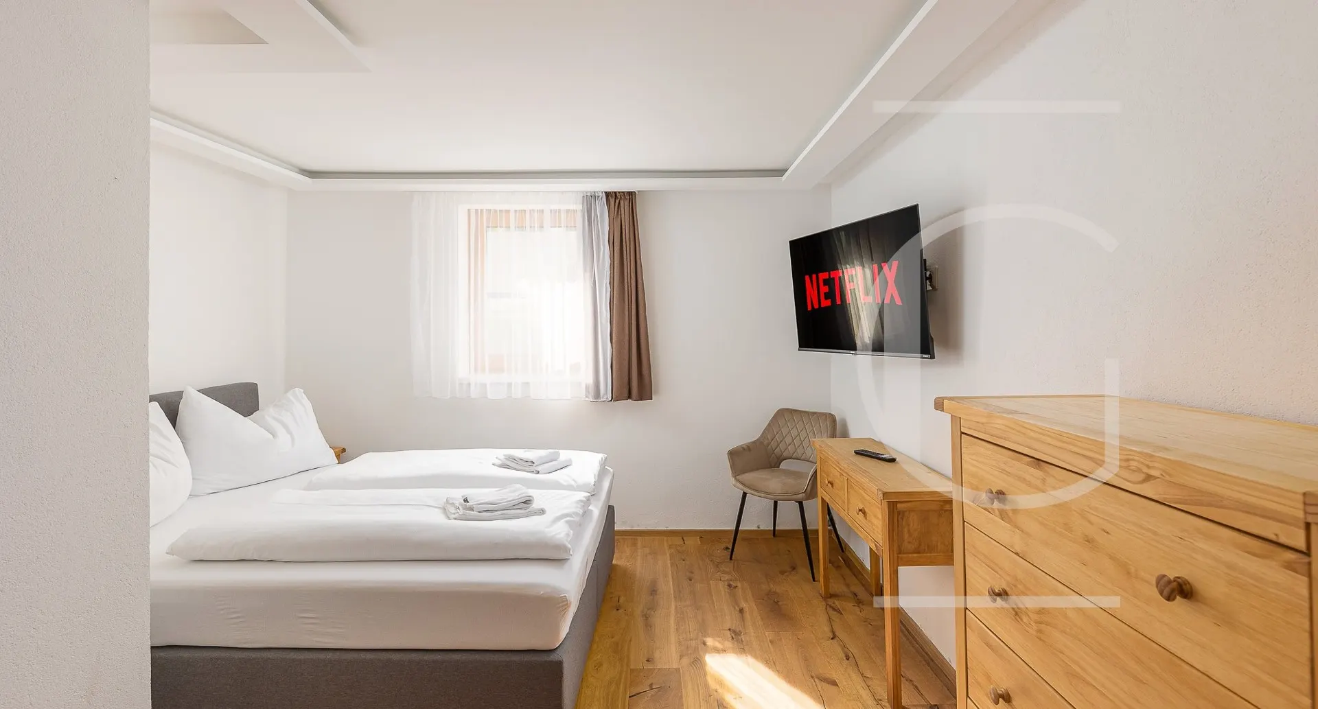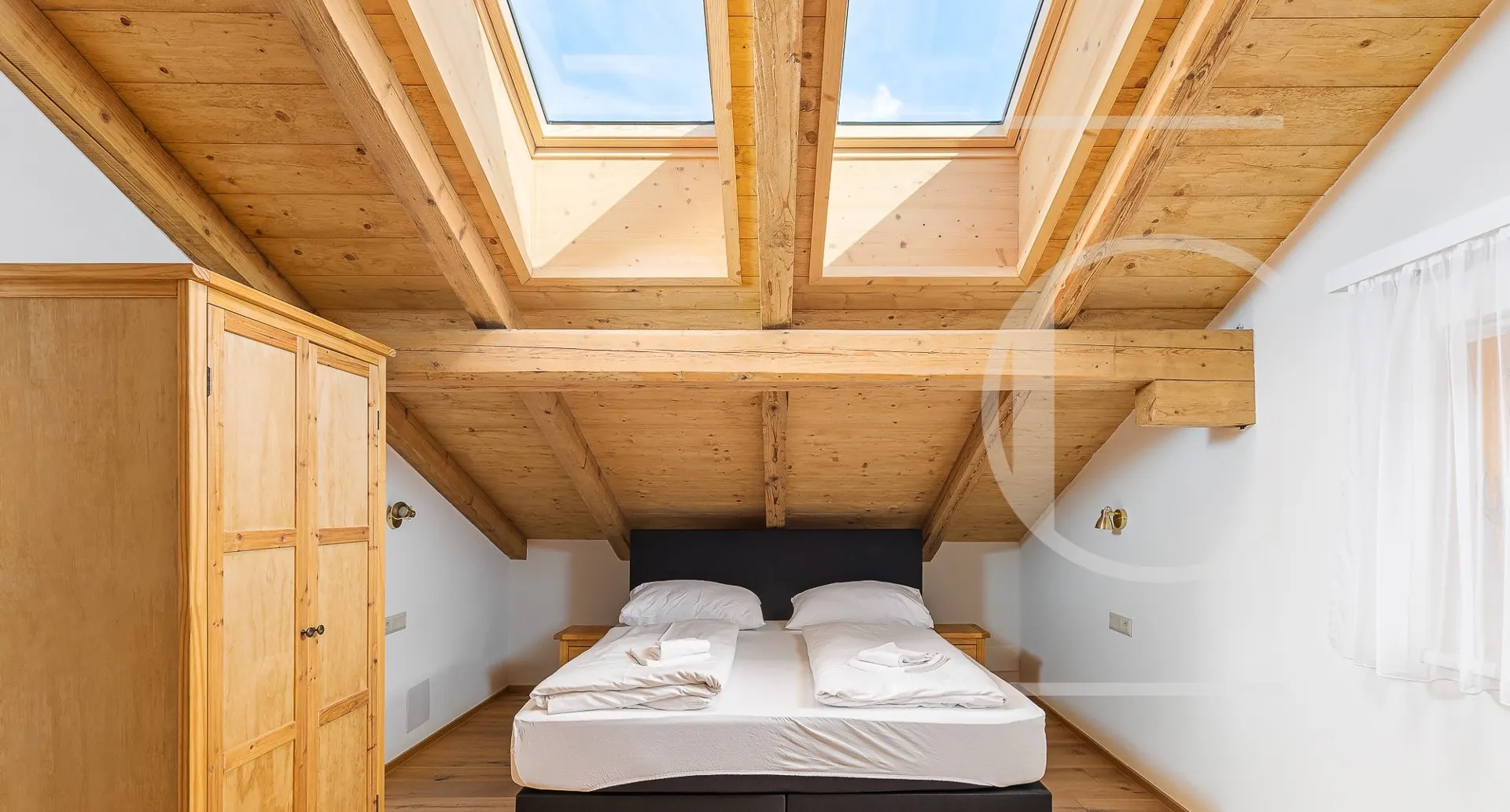 Die ausziehbare Couch bietet zwei zusätzliche Schlafplätze bei Bedarf. Auf dieser Etage befindet sich ebenfalls das Master Schlafzimmer, als auch zwei getrennte Badezimmer mit jeweils einem WC. Über die innenliegende Stiege erreicht man das Untergeschoss, wo sich zwei weitere Schlafzimmer mit südseitigen Fenstern befinden. Weiters befindet sich hier ein WC, Stauraum und der Heizraum.