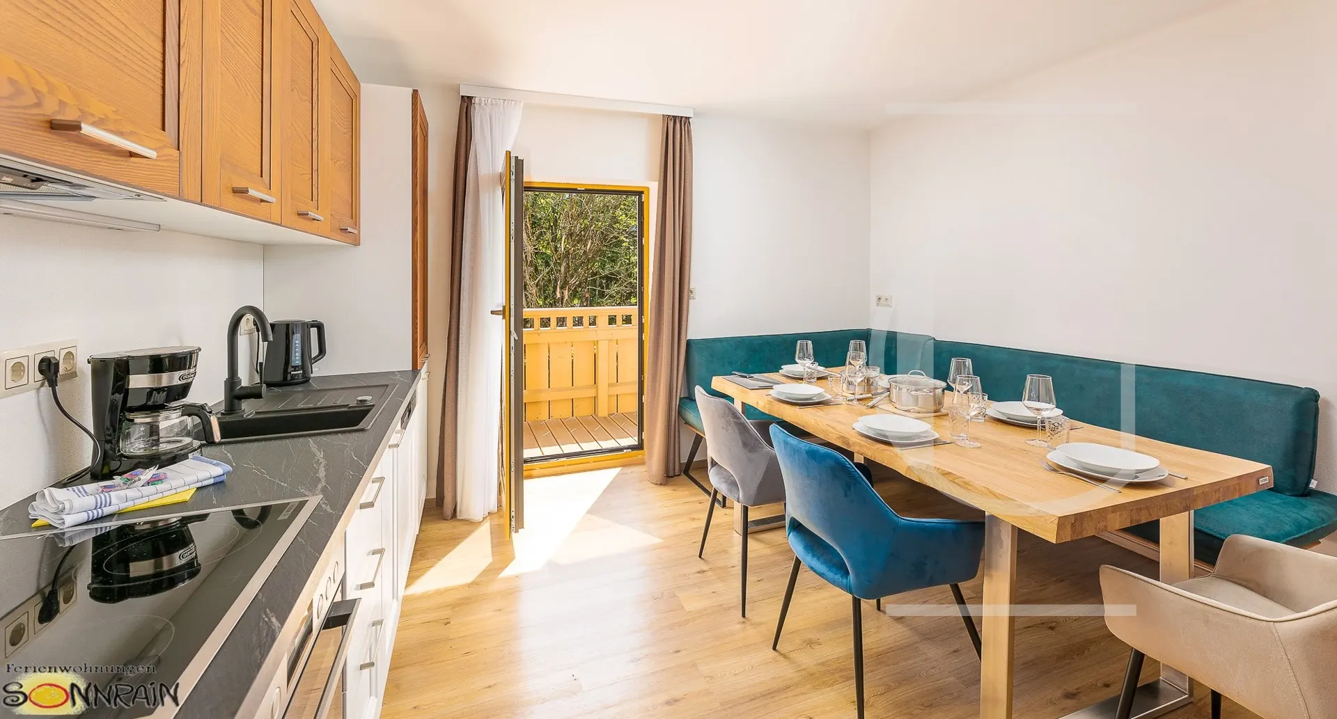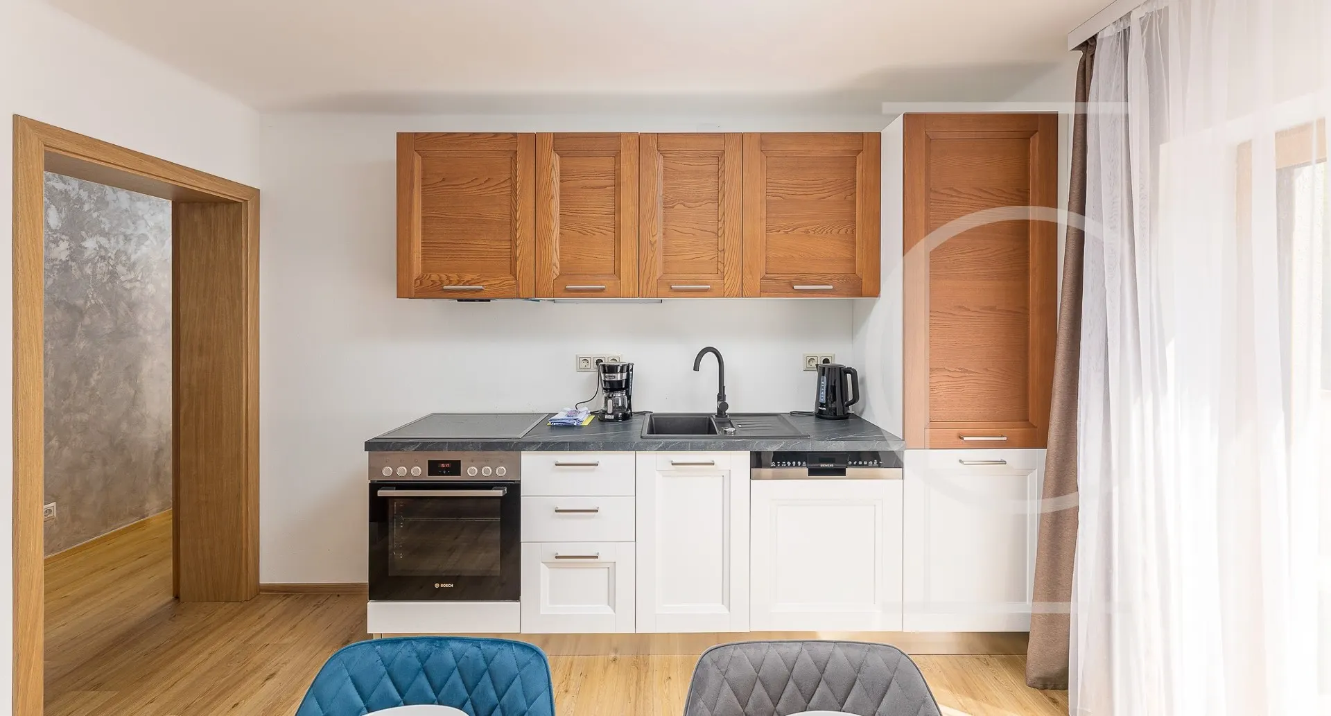 Betritt man das erste Apartment im Erdgeschoss, erreicht man über den Vorraum den großzügigen Wohn-/Essbereich. Die Küche ist mit hochwertigen Markengeräten ausgestattet.