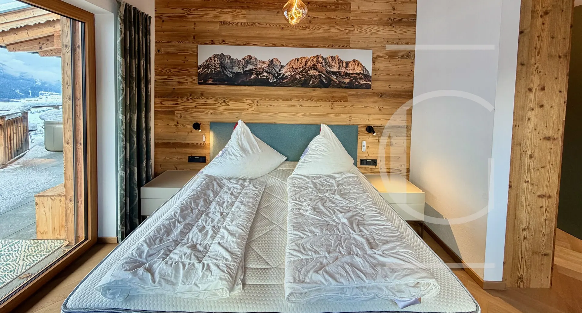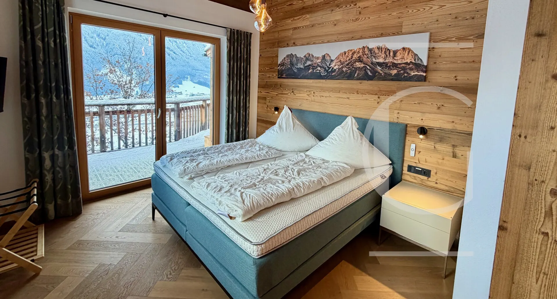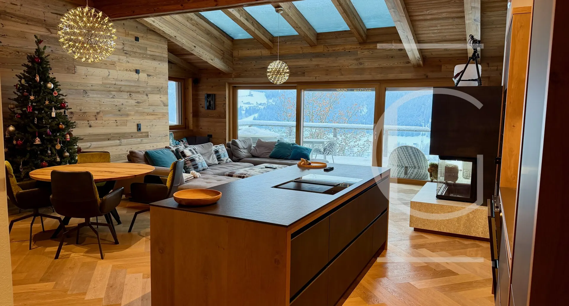 Nach der Küche erreicht man den gemütlichen Wohnbereich mit einem offenen Kamin, der nach langen sportlichen Tagen zum Erholen einlädt. Durchschreitet man die großen Fensterelemente, erreicht man den Balkon mit einer Fläche von 42 m².