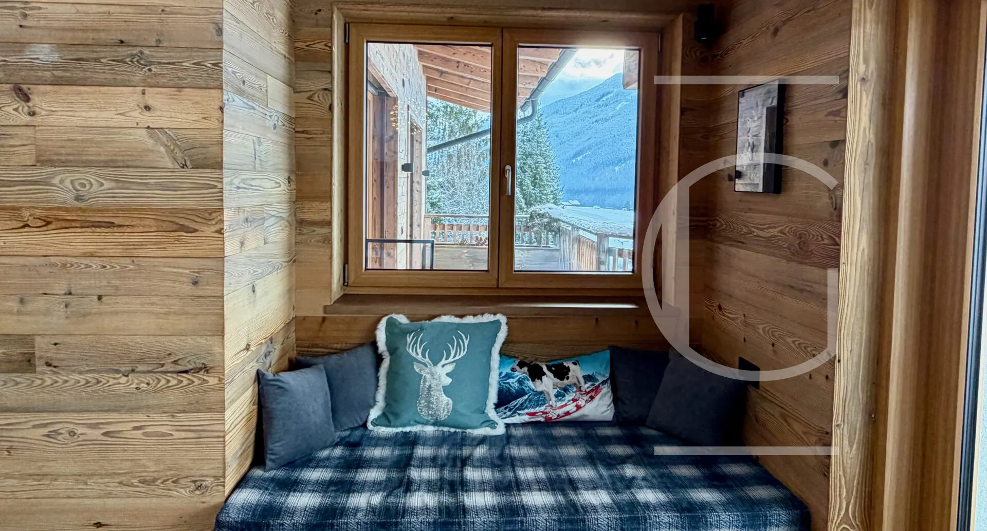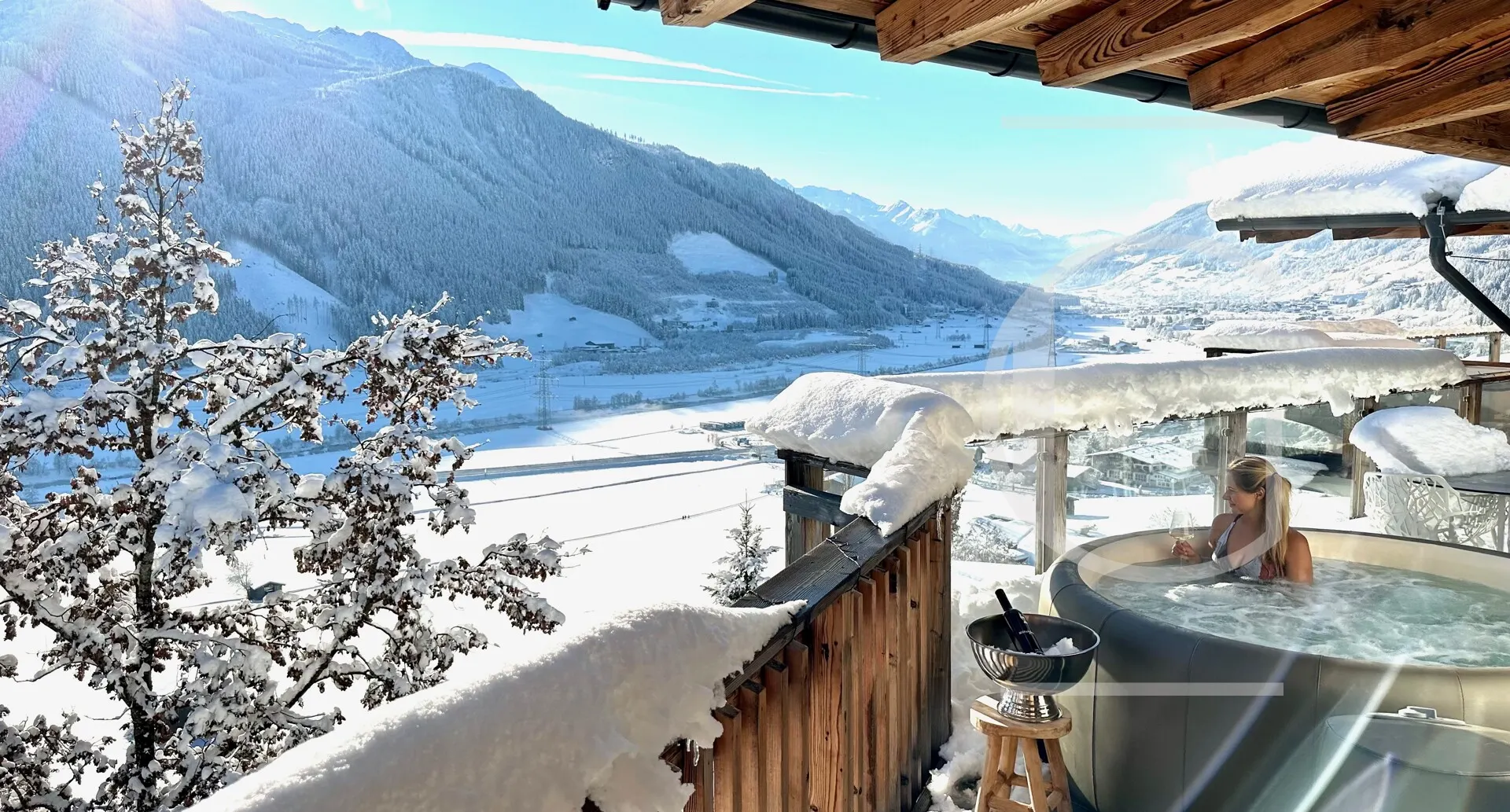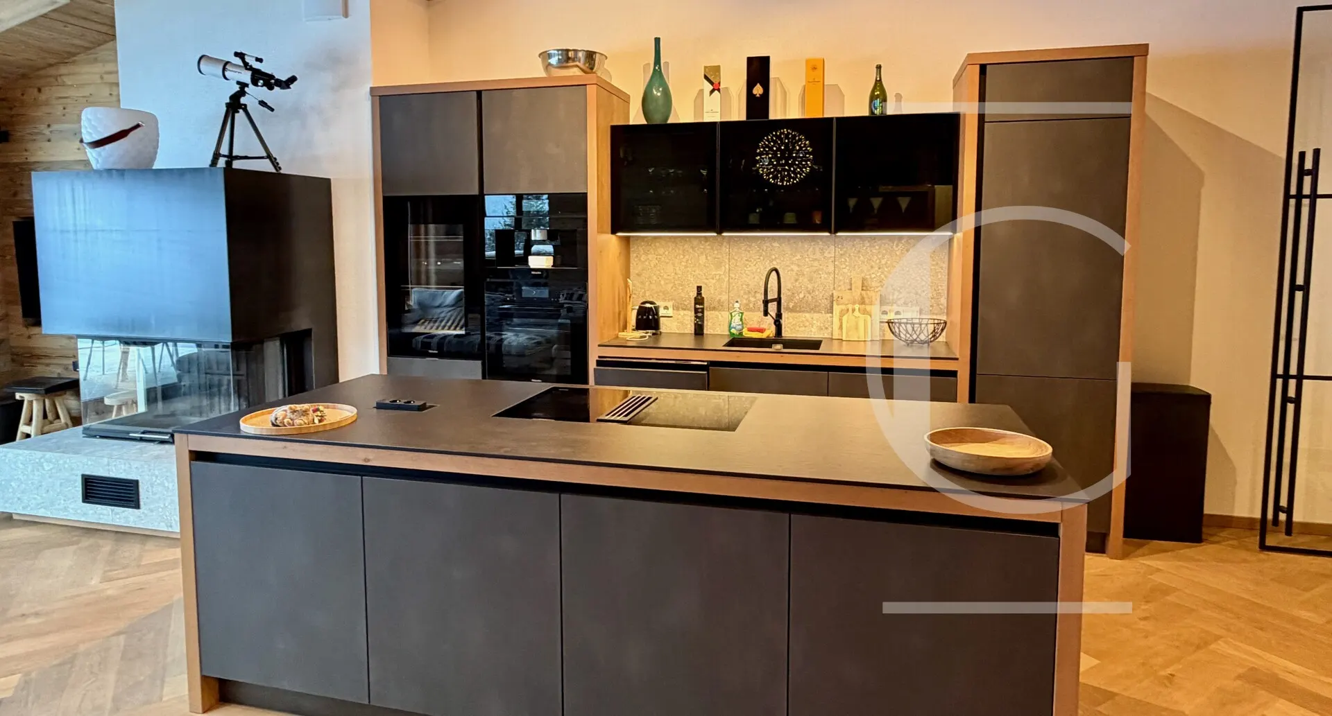 Nach der Küche erreicht man den gemütlichen Wohnbereich mit einem offenen Kamin, der nach langen sportlichen Tagen zum Erholen einlädt. Durchschreitet man die großen Fensterelemente, erreicht man den Balkon mit einer Fläche von 42 m².