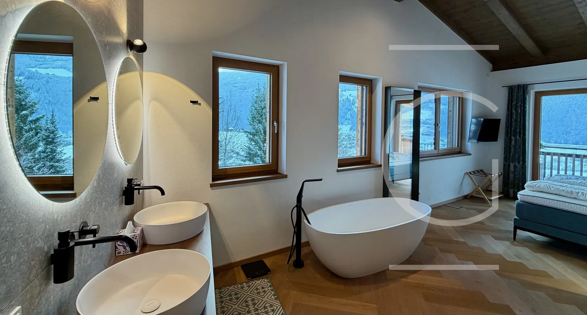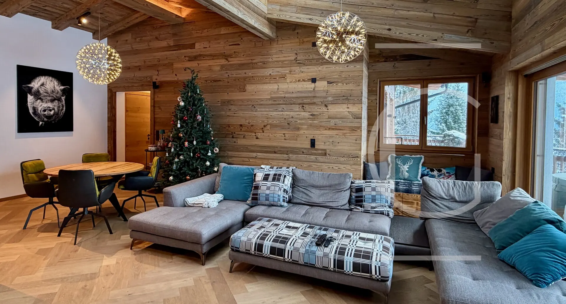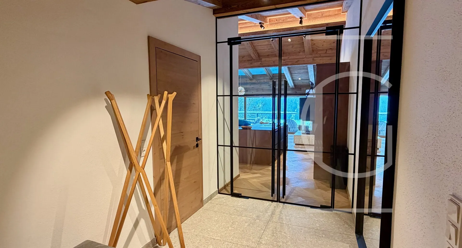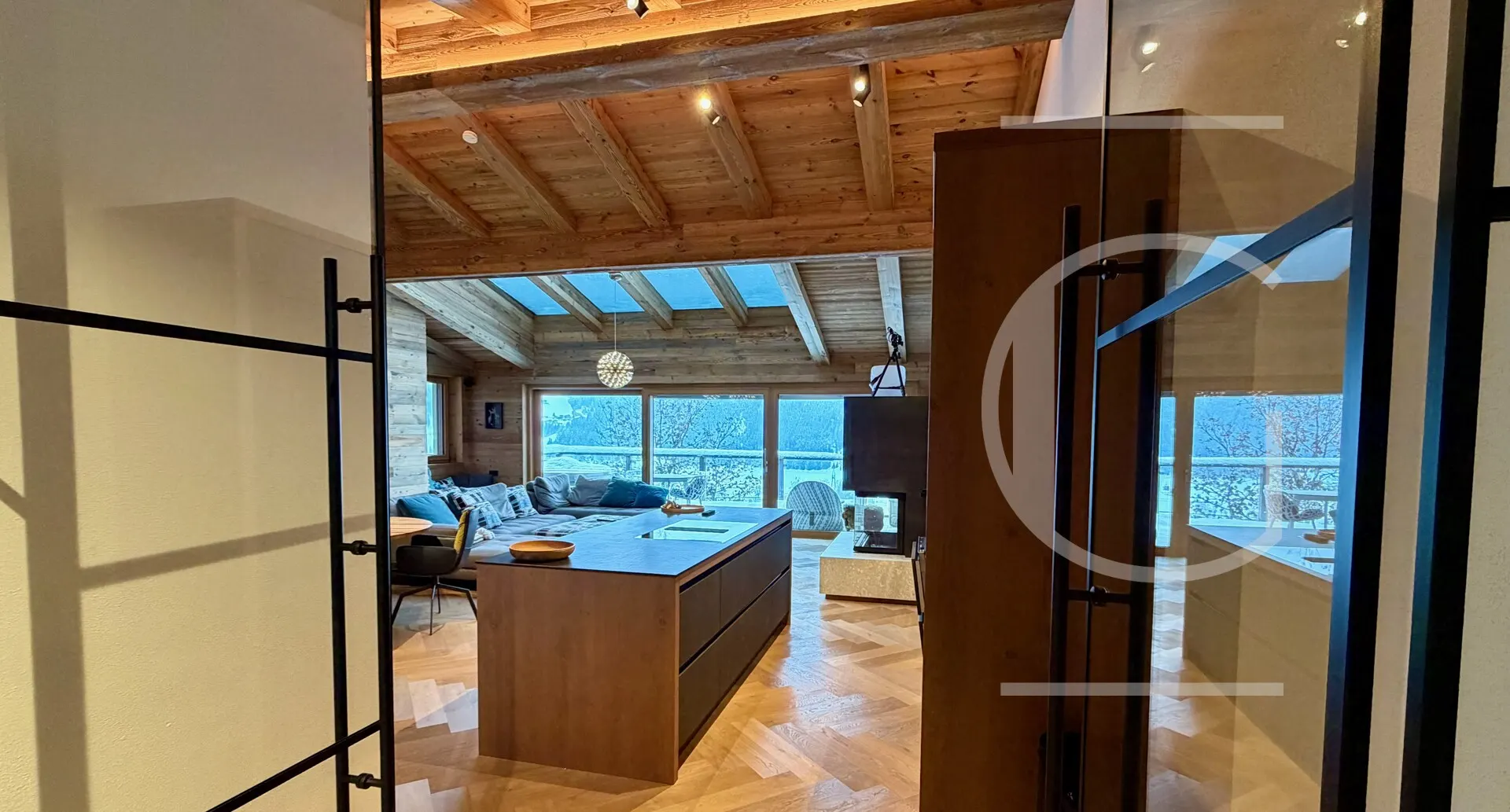 Durchschreitet man die Flügeltüren aus Glas findet man sich im weitläufigen Wohn-/Koch-/Essbereich wieder. Bereits hier verspürt man die Exklusivität des Penthouse: Der Sichtdachstuhl als Altholz mit indirekter Beleuchtung ist mit einem 3x4m Dachfestern ausgestattet worden, sodass der gesamte Raum mit Licht durchflutet wird. Durch die großen Panorama-Schiebefenster wird die Bergwelt der Hohentauern in diesen Bereich geholt.