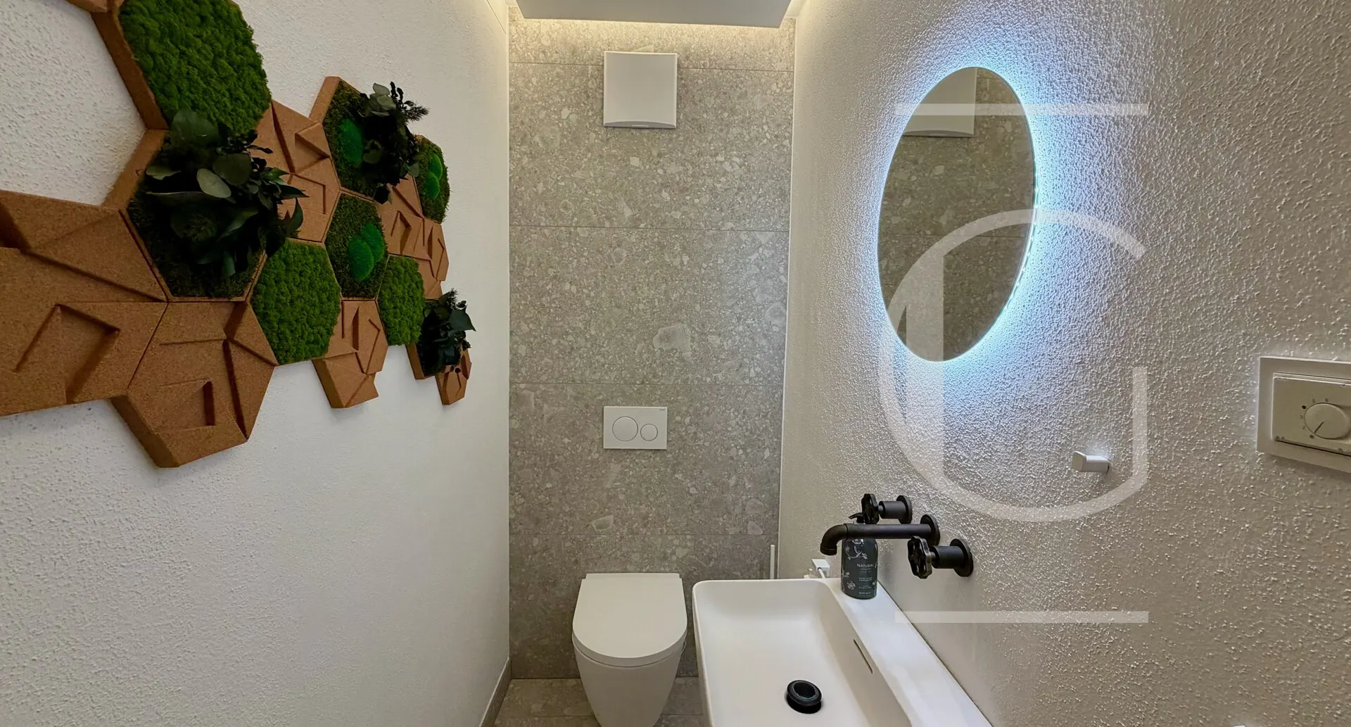 Über den Aufzug und das Stiegenhaus erreicht man von der Tiefgarage aus das Dachgeschoss, betritt das Apartment und erreicht den Landingbereich mit der Gaderobe. Dort anschlossen befindet sich ein separates Gäste WC.