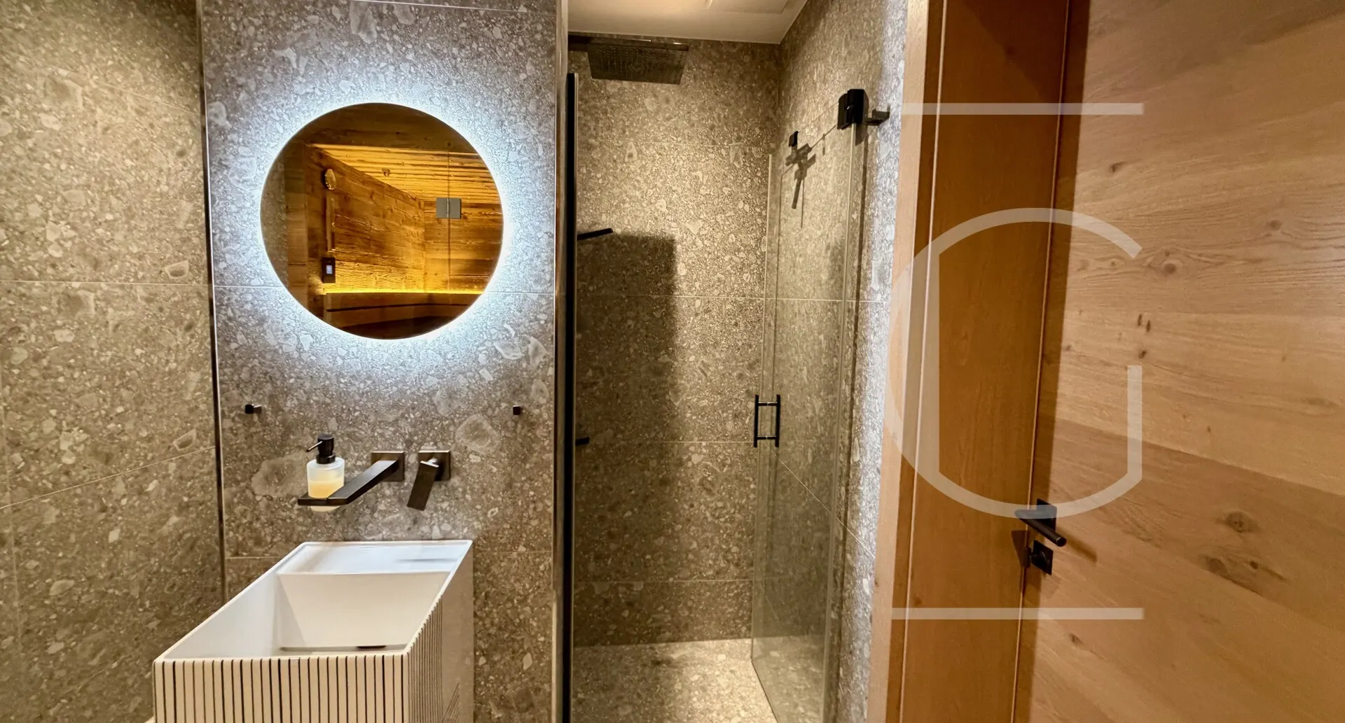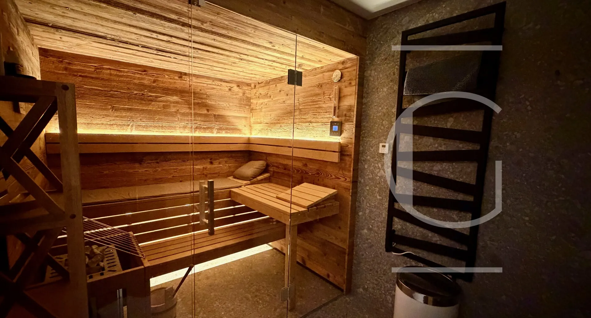 Von diesem Bereich aus erreicht man drei weitere Räume: Einmal das Gästezimmer. Diesem steht ein eigenes Bad zur Vefügung, in dem sich neben Dusche und WC auch die Sauna befindet. Abgrundet wird das Penthouse über den großzügigen Masterbereich, bestehend aus Schlafzimmer, freihstehender Designerbadewanne, Dusche und separates WC.