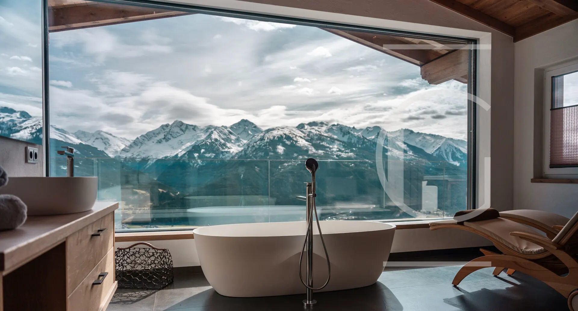 Ein absolutes Highlight ist der großzügig geschnittene Wohn-/Essbereich mit den großen Panoramafenstern mit Blick in die Bergwelt der Hohen Tauern. Egal ob von der Couch, dem Window Seat oder der Küche - von allen Positionen erblickt man die Gipfelwelt.